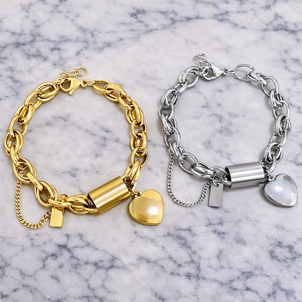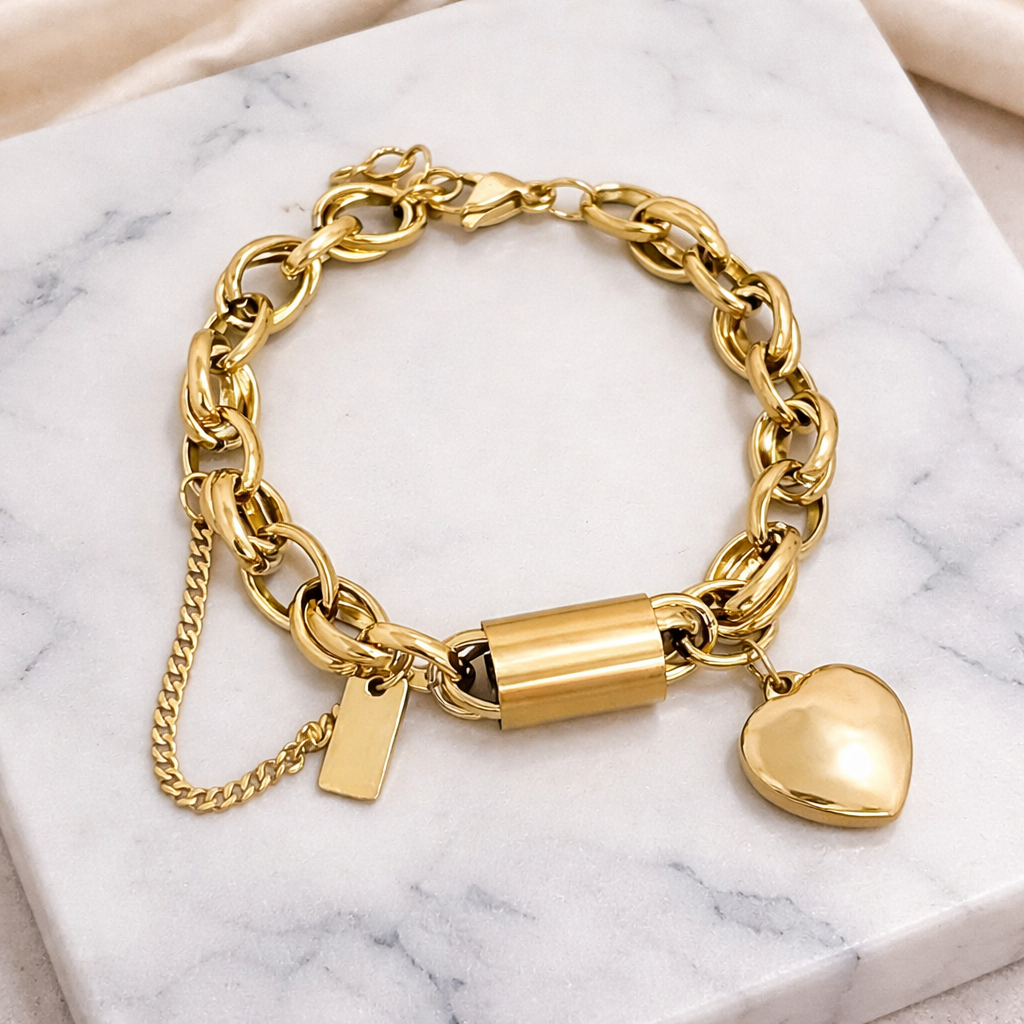 The Heartened Chunky Bracelet features a bold silhouette designed to make a confident style statement. With its substantial, eye-catching design, this bracelet adds a polished accent to both casual outfits and more dressed-up looks. Whether worn alone or paired with other accessories, it offers a modern way to highlight your personal style.